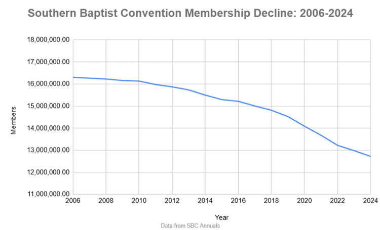 Over the last 18 years (2006-2024), SBC membership has declined by more than 3.5 million members (dropping from 16,306,246 to 12,722,266).
