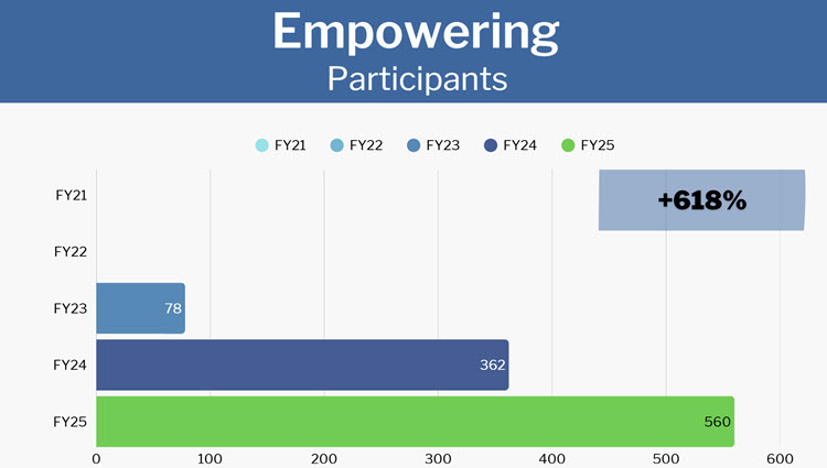 Empowering. After nearly 35 years of providing basic needs services, in FY22 Hope adopted a more expansive mission that included empowerment. Basic needs meet people’s needs for the immediate moment while empowerment services are focused on longer term growth especially through education that opens doors to living wage employment opportunities. Since launching mid-year in FY23, empowerment services have grown dramatically. This growth has been aided by the creation of a new classroom in FY23, the acquisition of laptops to create a computer lab in FY24, and increased partnerships in FY24 and FY25.