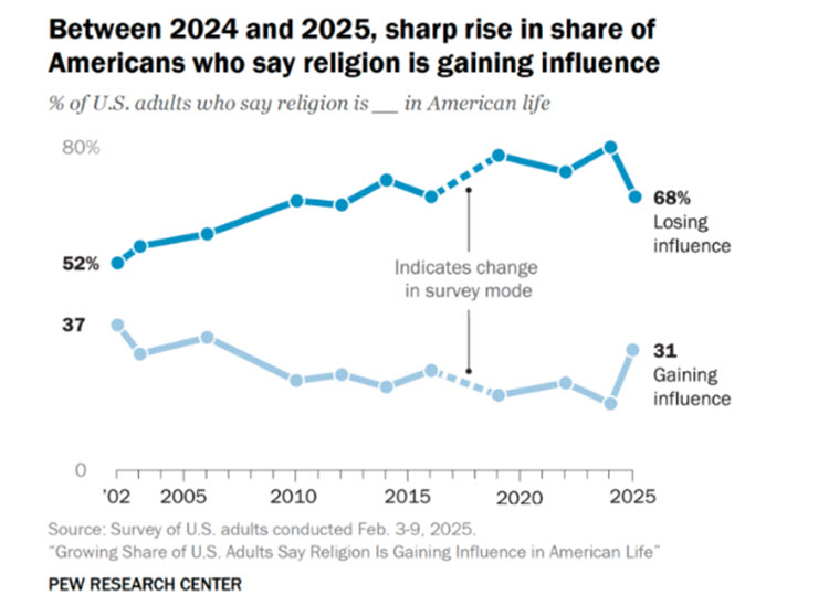 According to a Pew Research Center report, religion is gaining influence in American life. More specifically, there was a tremendous increase in the percentage of survey respondents who believed religion was gaining influence in American life in 2025 when compared to 2024 and also when compared to recent years.