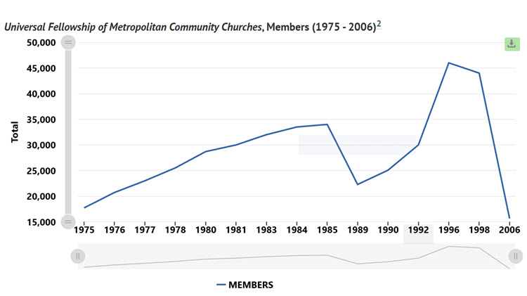 My search for longer term traditional metrics about denominational decline led me to the Association of Religion Data Archives. Their page dedicated to this tradition includes a number of statistical trends, but the data is only updated through 2006. This data shows membership growth occurred from 1975 to 1986 followed by decline for a few years before another period of growth in the 1990s. Radical decline begin in the early 2000s, which included the departure of the denomination’s largest church: Cathedral of Hope. A few years later Cathedral chose to affiliate with the United Church of Christ – a connection that continues to this day.