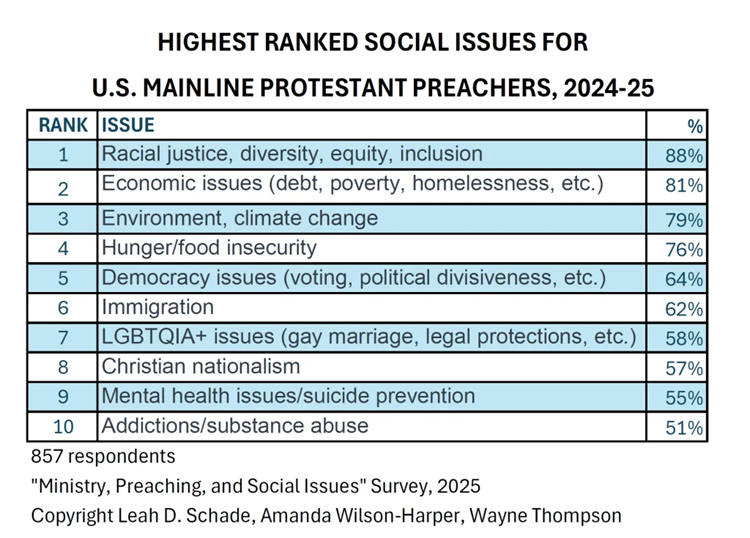 In their most recent survey (2025), nearly 6 in 10 respondents (59%) indicated that they include social issues in their preaching, teaching, or other ministry efforts at least 10 times a year. The highest ranked social issues in this wave are show below. The list is topped by (1) racial justice, diversity, equity, inclusion; (2) economic issues (debt, poverty, homelessness, etc.); (3) environment, climate change; (4) hunger/food insecurity; and (5) democracy issues (voting, political divisiveness, etc.).