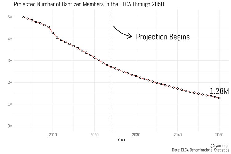 Looking ahead, current projections extend the same trajectory. Ryan Burge, a scholar widely recognized as one of the most prolific and insightful commentators on the statistical shifts in American religion, predicts that just as the ELCA has shrunk by half since its founding, it may be half its current size again by 2050. (Burge is also the author of the only book published in 2026 to have been rated as 5+ by So What Faith.)