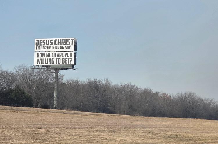 The first came while traveling between Texas and Oklahoma. Two billboards stacked one above the other carried a bold message: